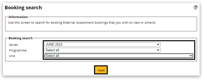 4. Select the 'Series', 'Programme' and 'Unit' from the available drop-down options in the 'Booking search' box.