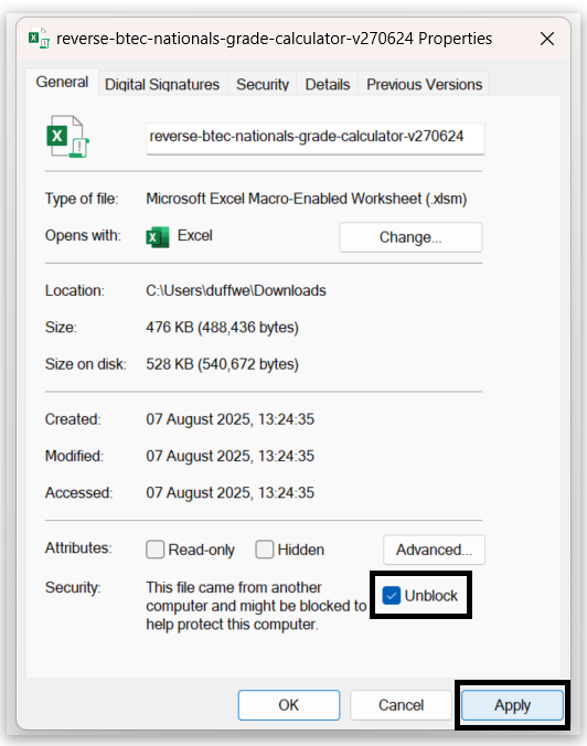 2. Next, select 'Unblock' under the general tab and then select 'Apply':