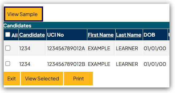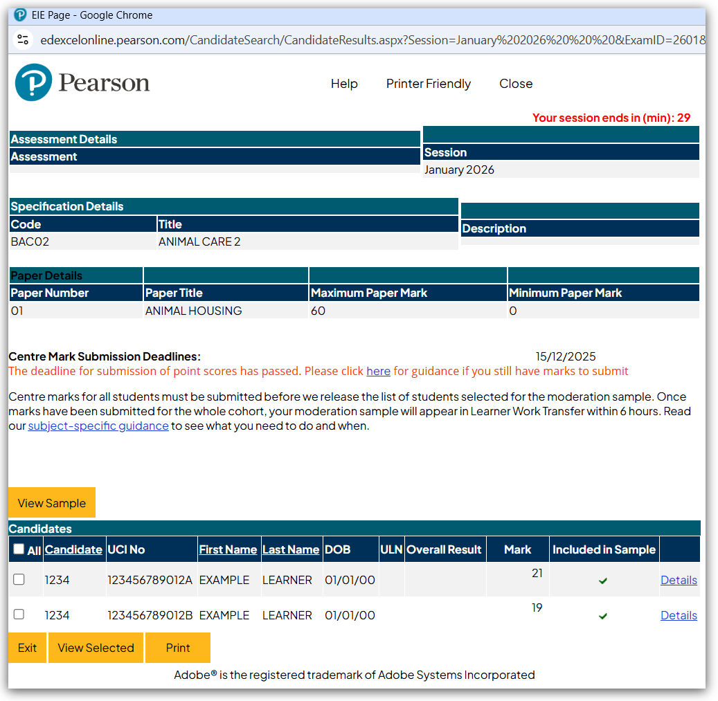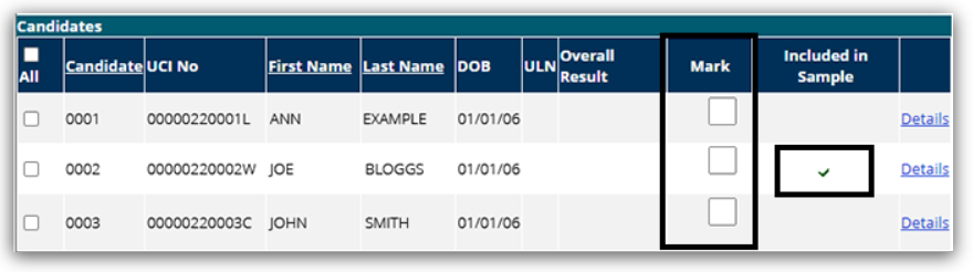 11. Once all marks have been submitted for the whole cohort, the learners included in the sample will be indicated by green ticks, as shown below: