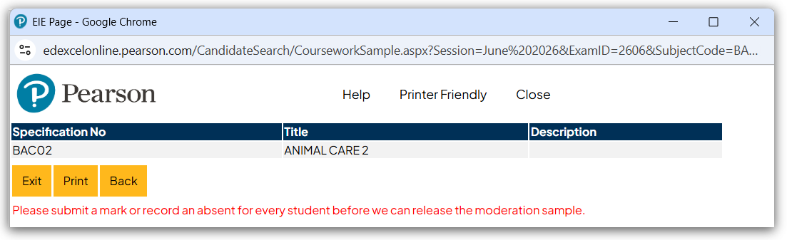 13. If you haven't submitted your centre marks and clicked the 'View Sample' button, you'll be prompted to submit all marks before you can view your sample.