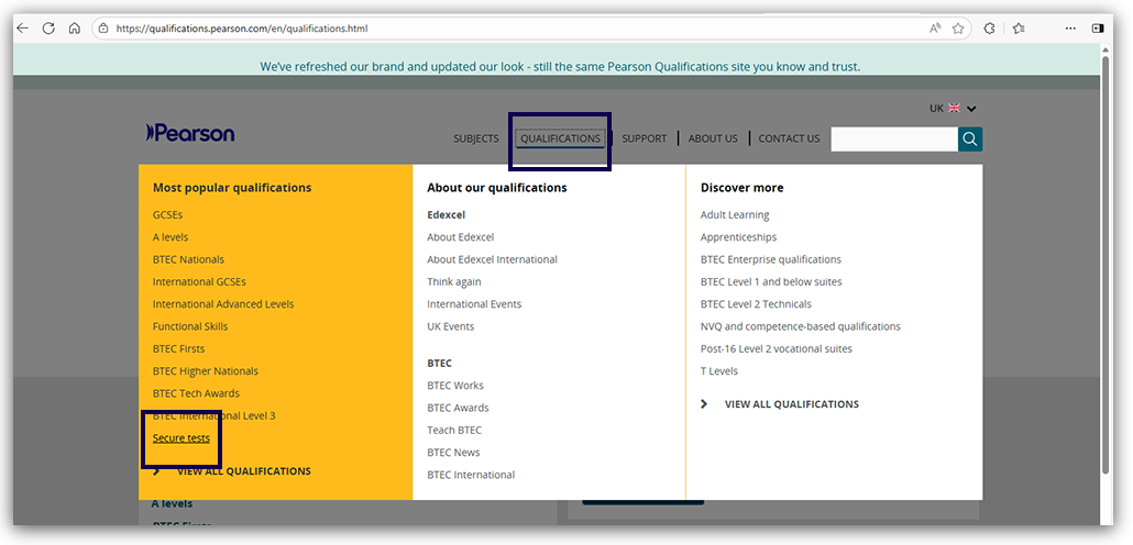 To find the secure tests page on the qualifications.pearson.com website, select 'Qualifications' at the top of the page, then select 'Secure tests' from the left-side menu. From this page, you will be able to access the same secure test links as above: