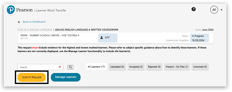 Moderation requests must include evidence for the highest and lowest marked learners. Please refer to the subject-specific guidance about how to identify these learners.