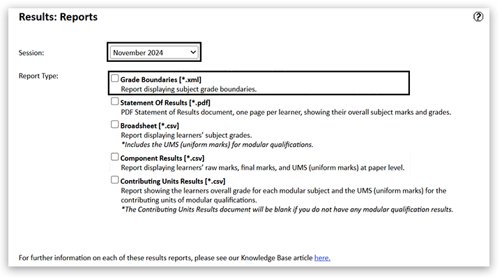 4. Select your exam session, then choose the report type. 'Grade Boundaries' shows the overall subject boundaries: