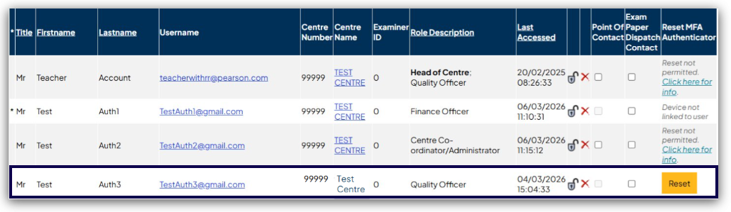 Please note: If the Reset MFA Authenticator column displays 'Reset not permitted' for a user, this means their role requires Pearson to perform the reset on their behalf. Please advise them to contact us for further guidance.