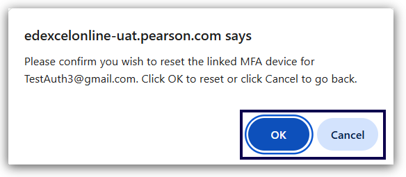 6. A pop-up will display asking for confirmation that you wish to reset the linked MFA device for this account. Click 'OK' to confirm: