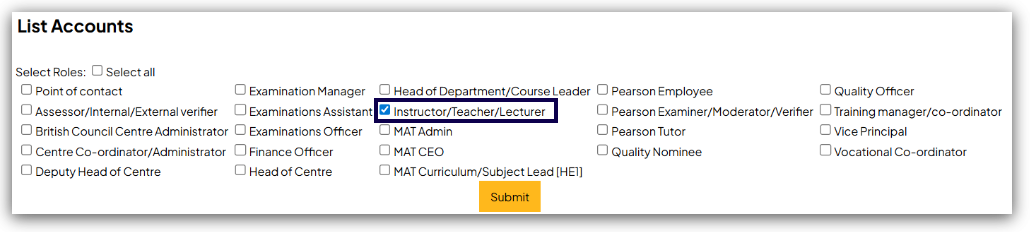 4. To change this, select the relevant role the account has been created as and click 'Submit':